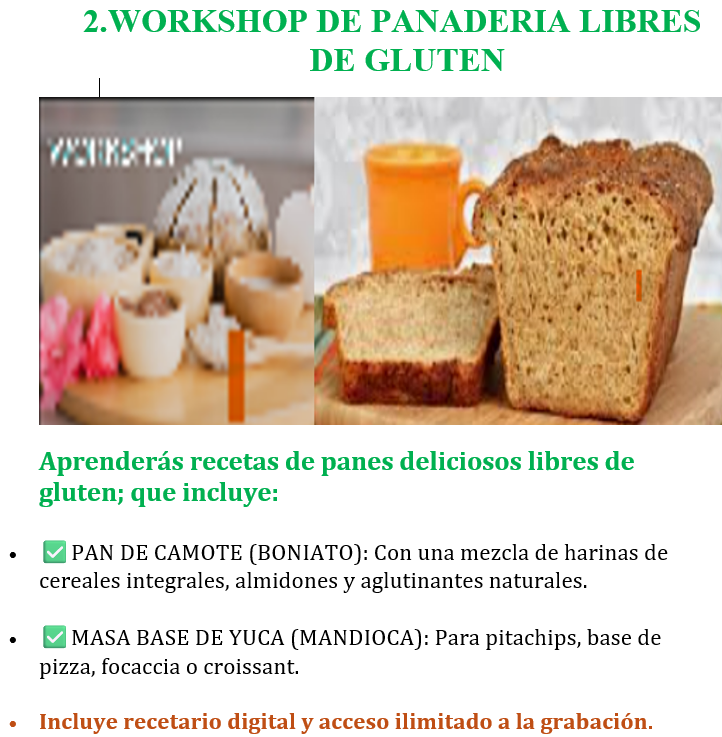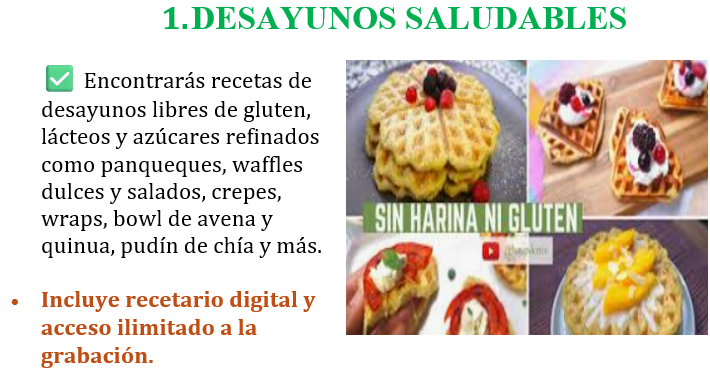 Por la compra de nuestro curso online de Postres y Tortas, también puedes adquirir con más del 50% de descuento: 1. Recetarios de Desayunos saludables 2. Recetas de PANES deliciosos libres de Gluten.